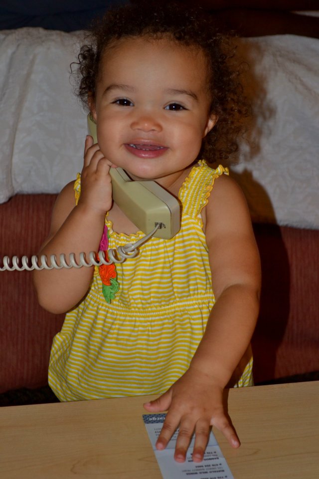One expression I have heard her using a lot lately has caused me to examine my own language usage – and no, I am not cursing a lot around my daughter.  It has been comical to observe her with her pretend phone conversations.  Anything to a Parker represents a phone – an ipod, calculator, remote control, pad of paper etc.  Over a year ago she pretty much became motivated to crawl when a cell phone was dangled in front of her to reach for.  Let’s just say the allure of a phone is present and she loves pretending to talk on it.