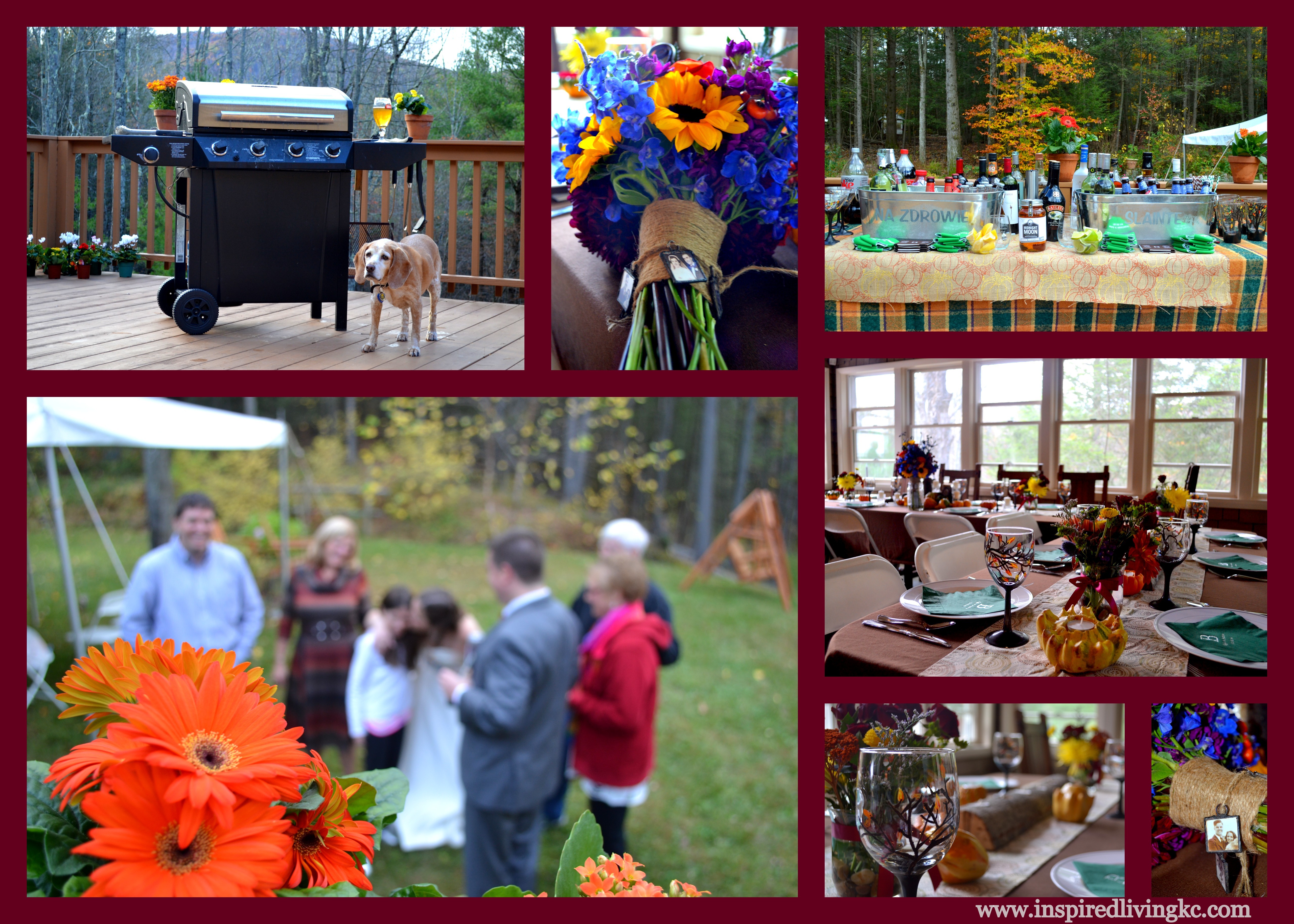 With my sister living half a country away, I was removed from all she had been doing with wedding details.  Her attention to including grandparents into the day was thoughtful testament to how much they both appreciate their families.  On her bouquet was a thread of small pictures of four sets of grandparents. Wedding Day Heather hand painted wine, martini and brewery glasses with trees and fall leaves especially for the day.  Inside the cabin it was clear she spent a huge effort on exactly how she wanted the tables to appear with table cloths, runners, flower arrangements, and candle holders created the day before out of split logs and gourds.  And just like there was no professional photographer, there was no professional caterer, although you would think the fajita dinner was professionally done.