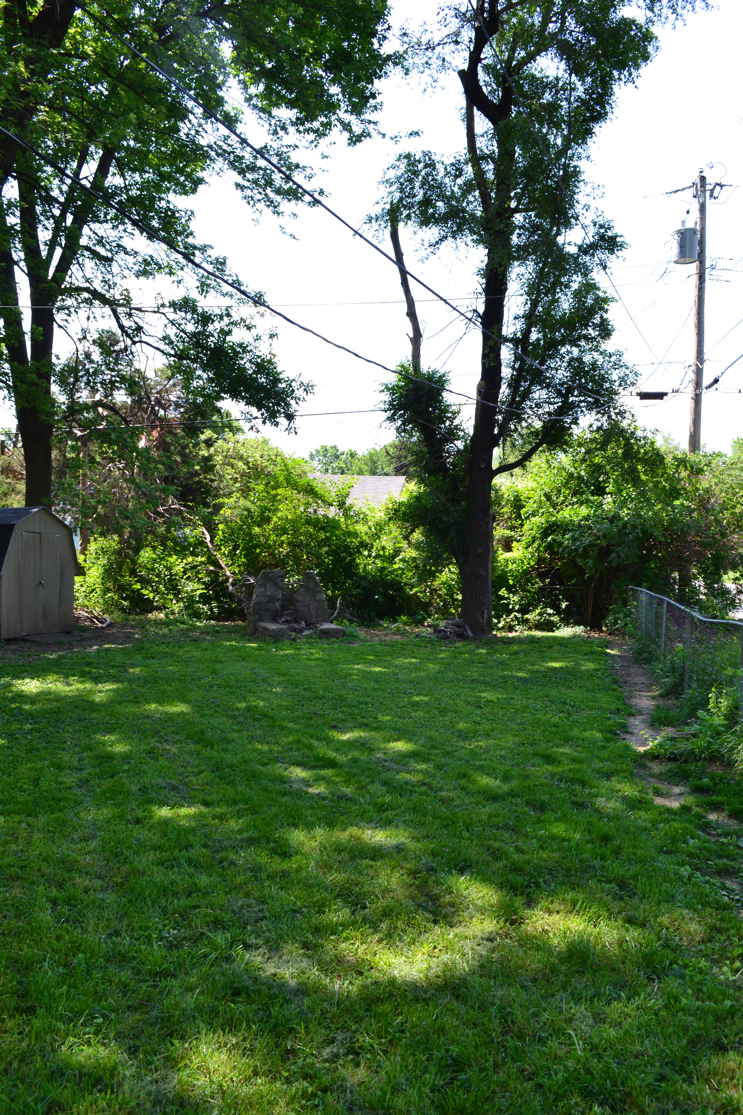 The yard itself is pretty sizable, with large shady trees and an old 1940’s style stone/cement fire pit.  The untamed limbs of the trees provide plenty of kindling should we ever be able to utilize the fire-pit.  There is a chain-link fence separating the yard from the street parallel to our house.  The positioning of our property on the street allows all of our neighbors walking and driving by to take notice of the ugliness that is our yard.  It’s difficult to tell what covers most of the ground whether it be grass, weeds or mostly ivy.  And our muppet-like furry dogs have taken the liberty of running a path along the fence line to greet other dogs and pedestrians.