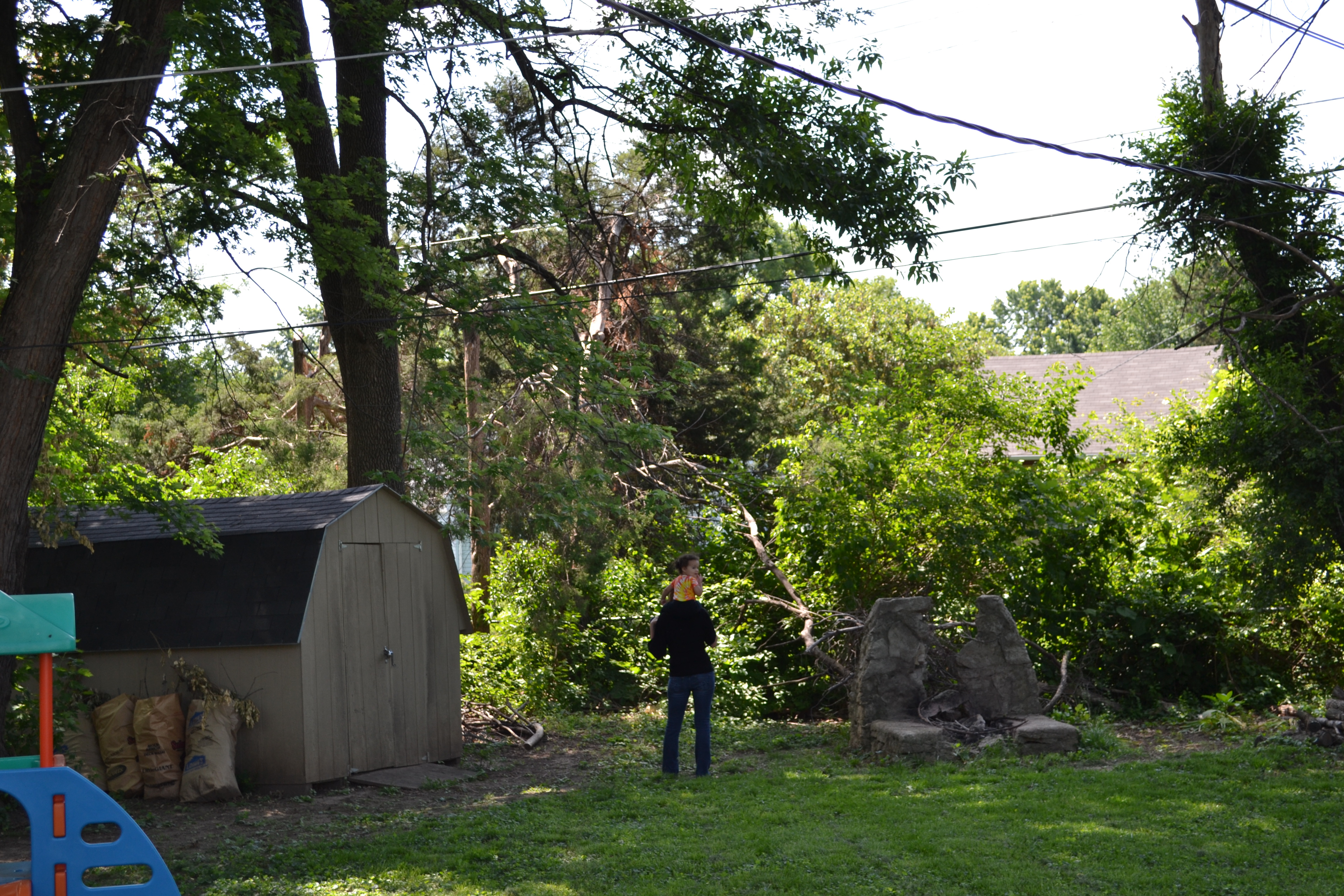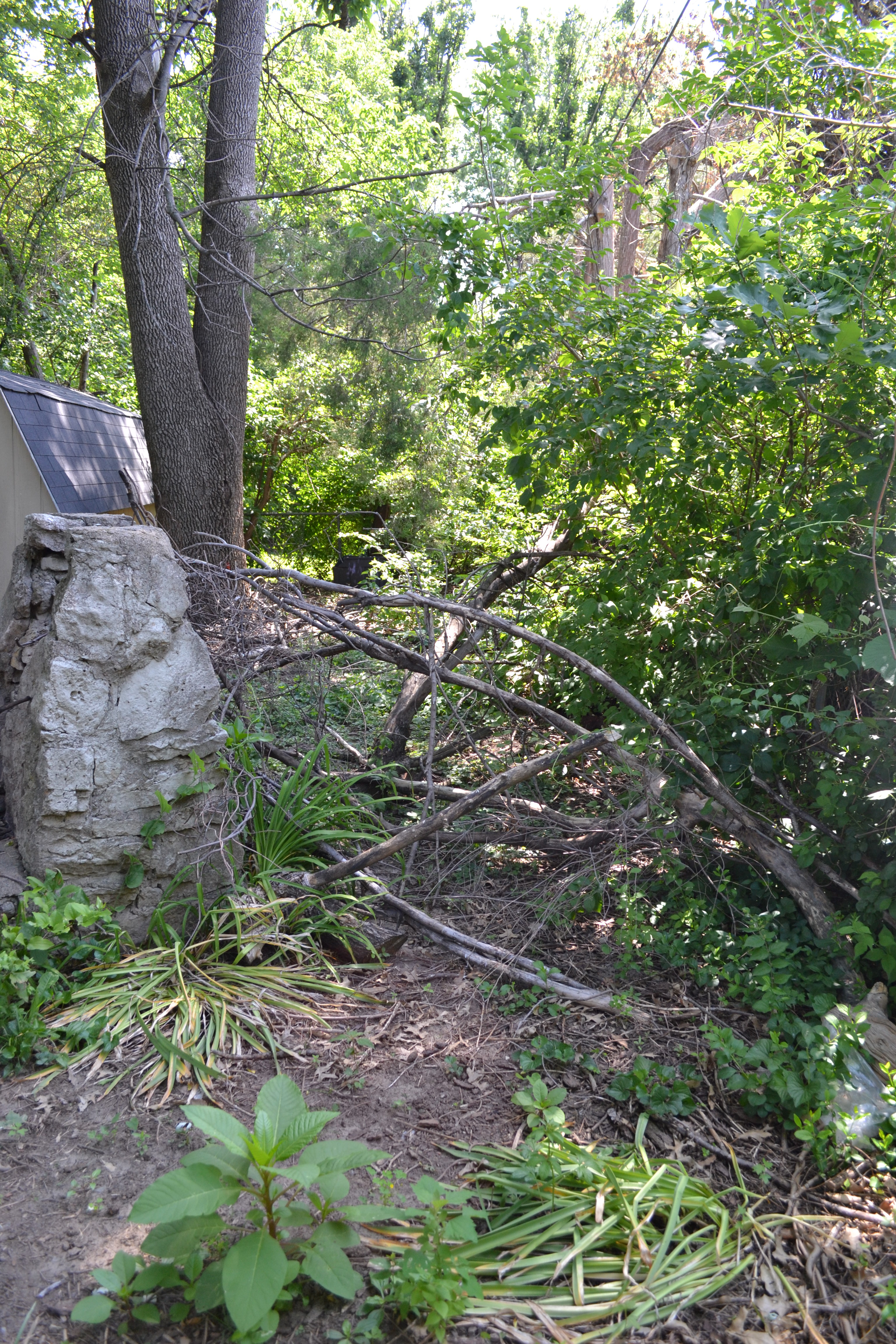 (sigh) This is my backyard.Despite what the picture depicts there has been no natural disasters here.  Just four years of bare minimum yard work taking place in this pathetic outdoor space.  No passerby would even suspect there were two nature loving fools living within these walls, unfortunately, we enjoy the nature in parks rather than cultivating a park in our own backyard.