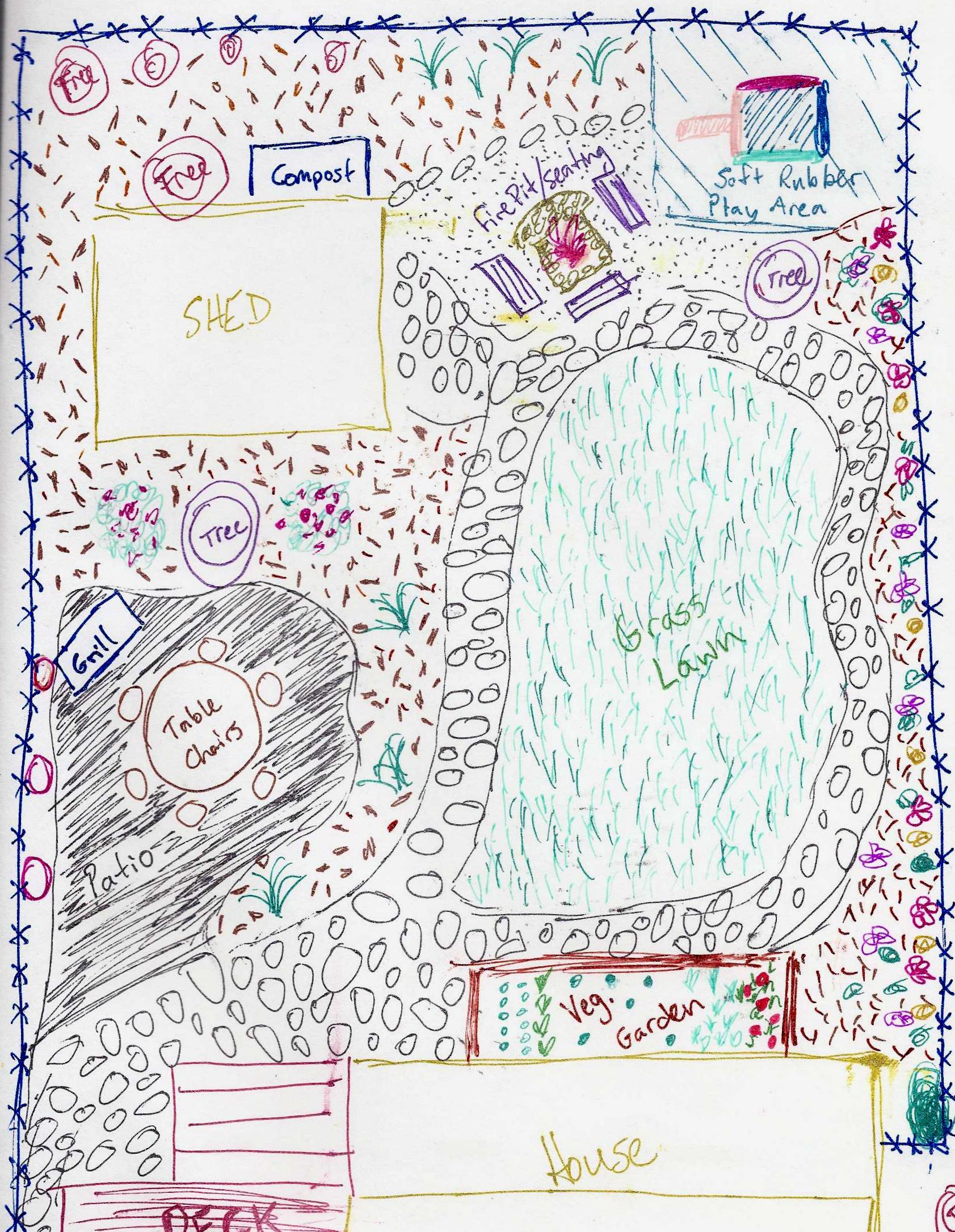 This is my dream yard space complete with patio, garden areas, grassy pad, fire-pit seating, play area and path. Now I’ll just need the powers of the internet for support and accountability.
